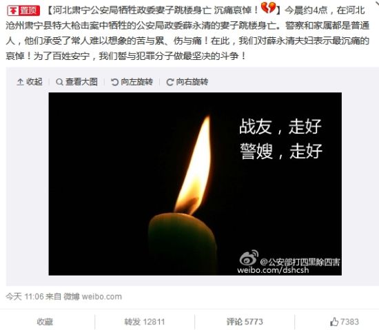 今天(10日)上午,河北肃宁县传来悲伤消息,当日凌晨,在河北特大枪击案中牺牲的公安局政委薛永清的妻子,在宾馆跳楼身亡。据接近警方的消息人士称,薛永清妻子刘文娟应是悲伤过度跳楼。事发当时,刘与其兄站在楼顶,没有被其哥哥拉住,纵身而下。