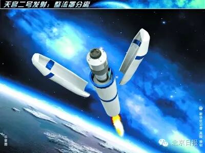 二级火箭带着天宫飞出大气层,整流罩被火箭抛掉。