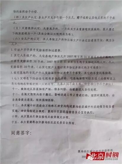有“女儿户”告诉“北京时间”,自己的孩子当初在村里落户时,还被迫签了一个“放弃拆迁补偿资格”的协议。