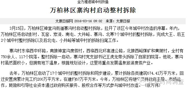太原市万柏林区今年启动7个城中村的整村拆除,寨沟村就是其中之一。3月15日,寨沟村拆迁启动,目前已经基本结束。