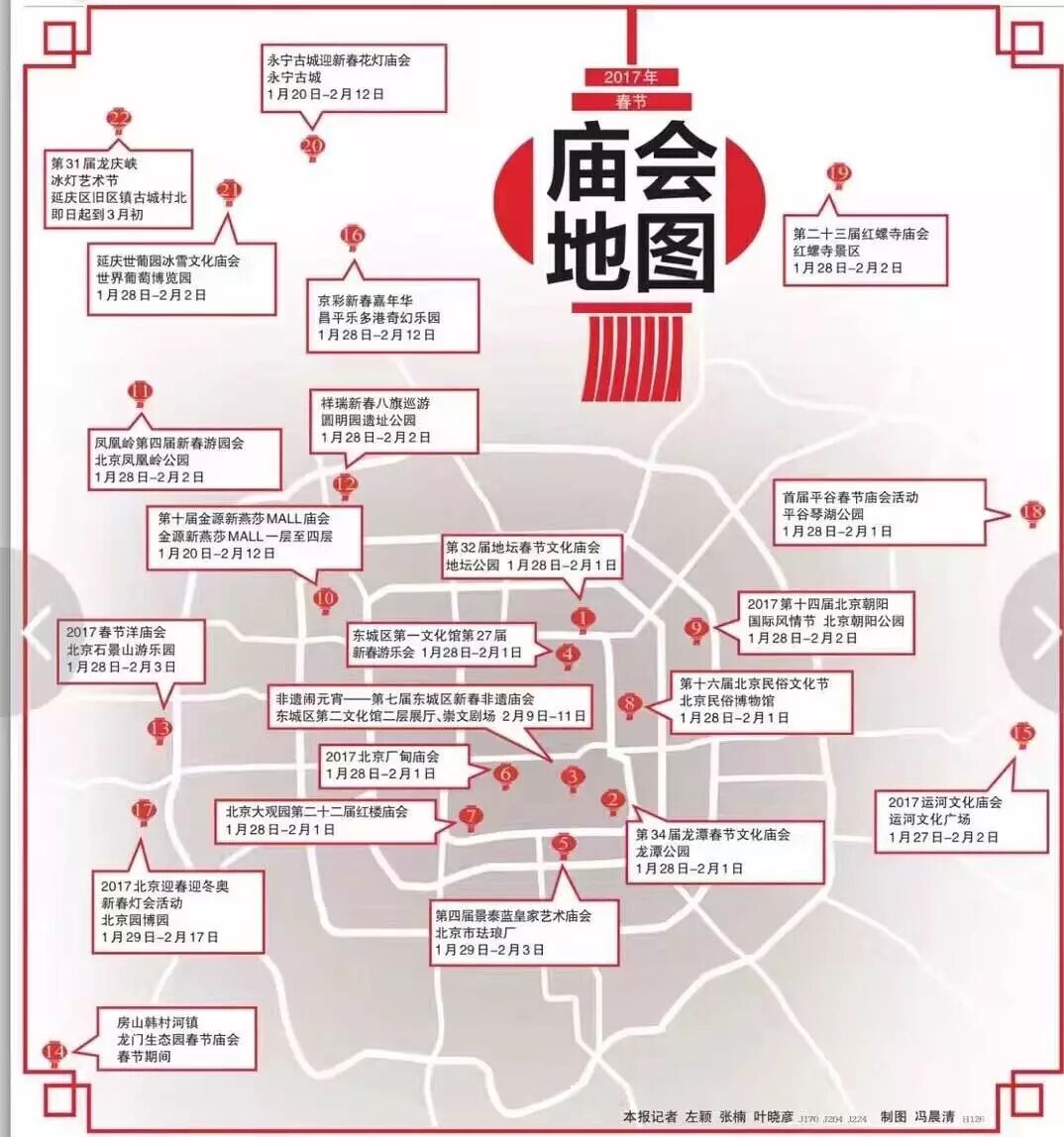 除了这些,还有凤凰岭游园庙会、通州运河文化庙会、平谷区首届春节庙会、延庆世葡园冰雪文化庙会等别具特色的庙会,送您一张庙会地图,想去哪个呢?(点击查看大图哦)