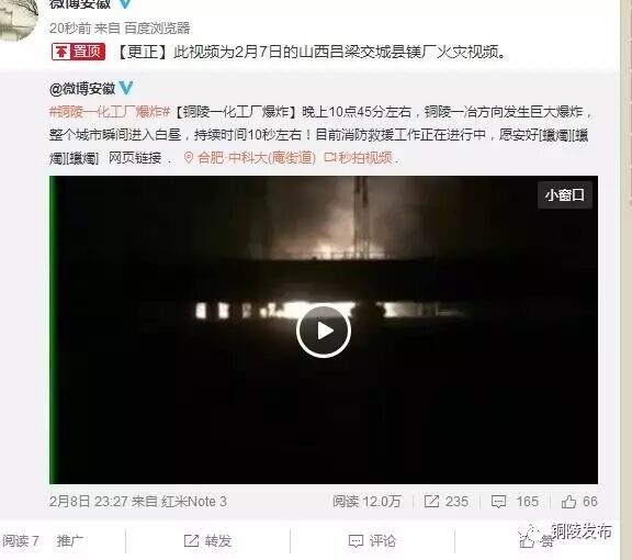 >之后,@新浪安徽 也在放出的视频下评论:“视频来自网络,信源待考证。”