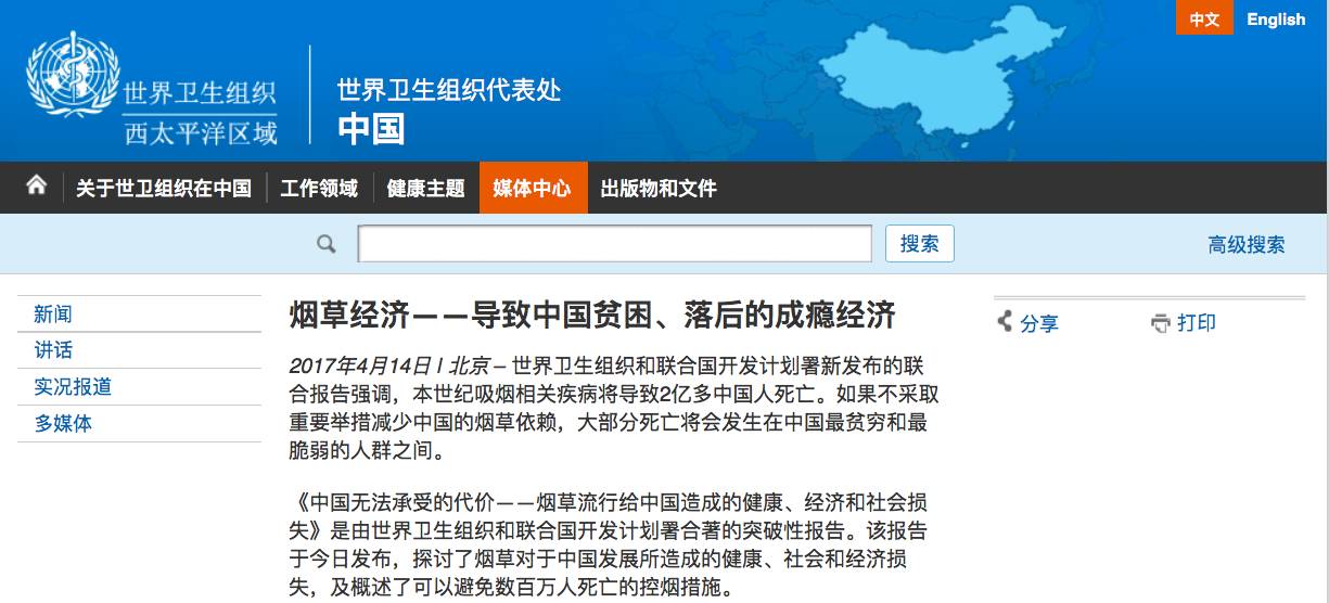 April 14, the World Health Organization and the United Nations Development Programme report noted that China was the tobacco capital of the world, the world's largest producer and consumer of tobacco.
