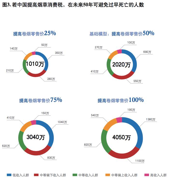 此外,世界卫生组织还建议,将卷烟零售价提高50%,每年可使政府收入增加约660亿美元,重要的是,这种幅度的提价,可在未来50年中避免2000万人过早死亡,避免近800万人沦于贫困,同时可避免约1300万人(大多是贫困人群)被灾难性医疗支出所困扰。