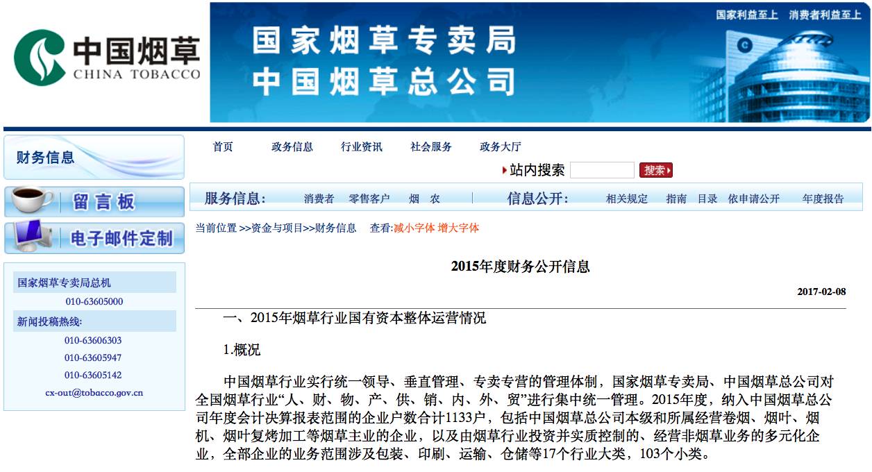 每经小编在国家烟草专卖局官网上发现,截止2015年底,中国烟草行业实现营业收入12655亿元,同比增加491亿元,增长4.16%。
