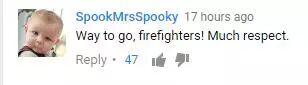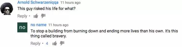 一位网友回复道:“我告诉你他在干什么——这位消防员正在努力避免整栋楼毁于火灾,拯救他人的生命,这叫做‘勇敢’。”