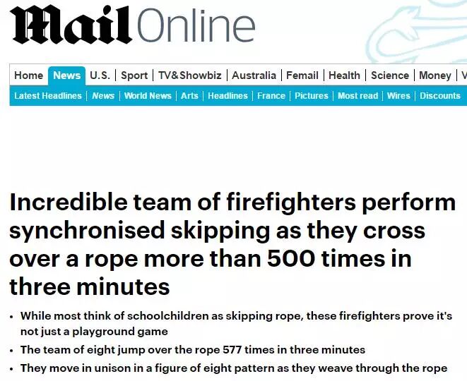 英国《每日邮报》标题这样写道:令人称奇的同步率——这些消防队员在3分钟内竟然跳了500多下!网友表示,这样的活动对团队合作意义非凡,这对肩负救人使命的消防员来说尤其重要。