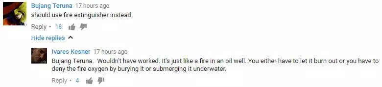 对“应该用灭火器”的质疑,有网友解释,灭火器在这种情况下是没有用的。这就好像油井起火,要么等待其燃烧殆尽,要么将其掩埋或置于水下,以隔绝氧气。