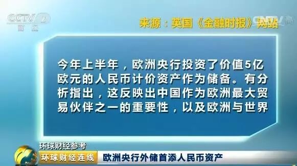 “欧洲央行(此次对人民币)的投资规模不大,但具有重大象征意义,对于继美元之后世界第二大储备货币欧元背后的欧洲央行来说,在自己的外汇储备组合中持有人民币资产,是用行动表明他们看好中国经济和中国货币的未来走势。”
