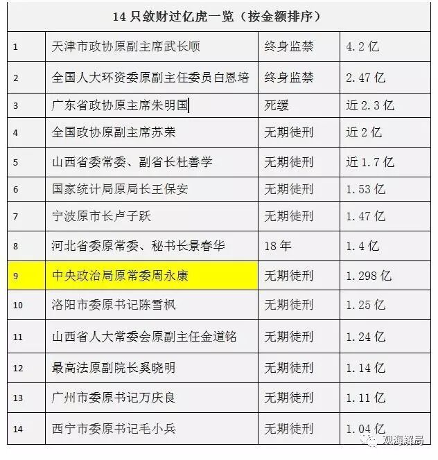 2015年6月11日,周永康因受贿1.298亿元被判无期徒刑。这是十八大以来首个敛财过亿的大老虎。其还是2015年领刑的大老虎中唯一受贿过亿的,而2016年共有6人,2017年至今已有7人。