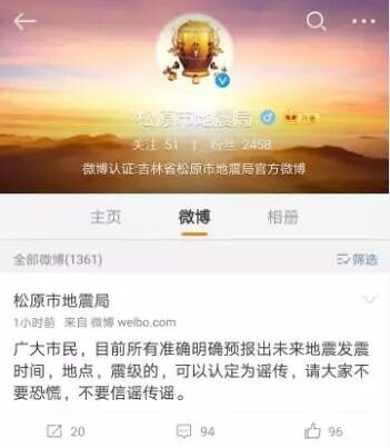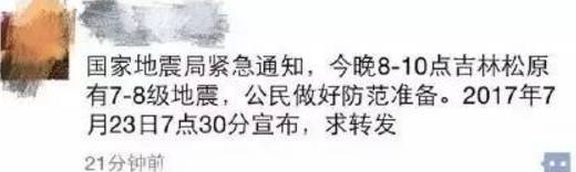 The author:(作者)aaapublished in(发表于) 2017/7/23 7:56:50 吉林松原今晚有7级地震?地震局:“可能性很小”